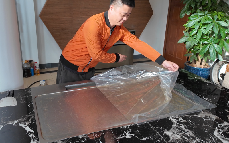2、用鏟子清除臺(tái)面上的防銹保護(hù)油,用廚房用紙或毛巾將煎板擦拭干凈(或直接用廚房用紙擦拭)